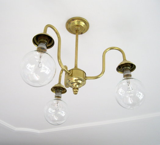 I chose a beautiful three-armed light - I love the shape of the arms - and with some Brasso and elbow grease, she came up a treat. We bought some large, round light bulbs, because I love the mix of old and new, and Mark wired it up. I couldn't be happier, and do you know how much that light was?... $10! (plus the bulbs). We still need to find the do-dackies (that's the technical term!) that cover the screw-in part of the bulb, and then it will be perfect.
