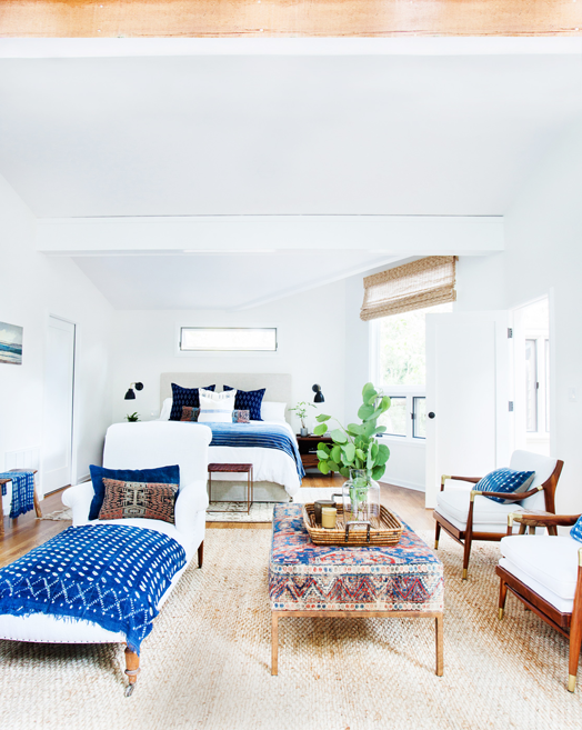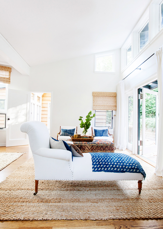 I thought I recognised the style used in this room and wasn't surprised to learn that it's the work of one of my favourite interior designers, Amber Lewis - I've featured her home twice on the blog, here and here. Like me, Amber likes to work with crisp white walls and neutral larger furniture pieces. It helps with a sense of calm, and then allows you to layer colour and pattern on top in rugs and soft furnishings.