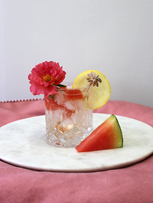 This pretty little number is "Green Tea-Lychee Twist". The SodaStream Green Tea-Lychee flavour is divine on it's own - light and fresh, a real thirst quencher - so we kept it simple with some ice, watermelon and a slice of lemon on the side. This would be great on a hot afternoon with your girlfriends.